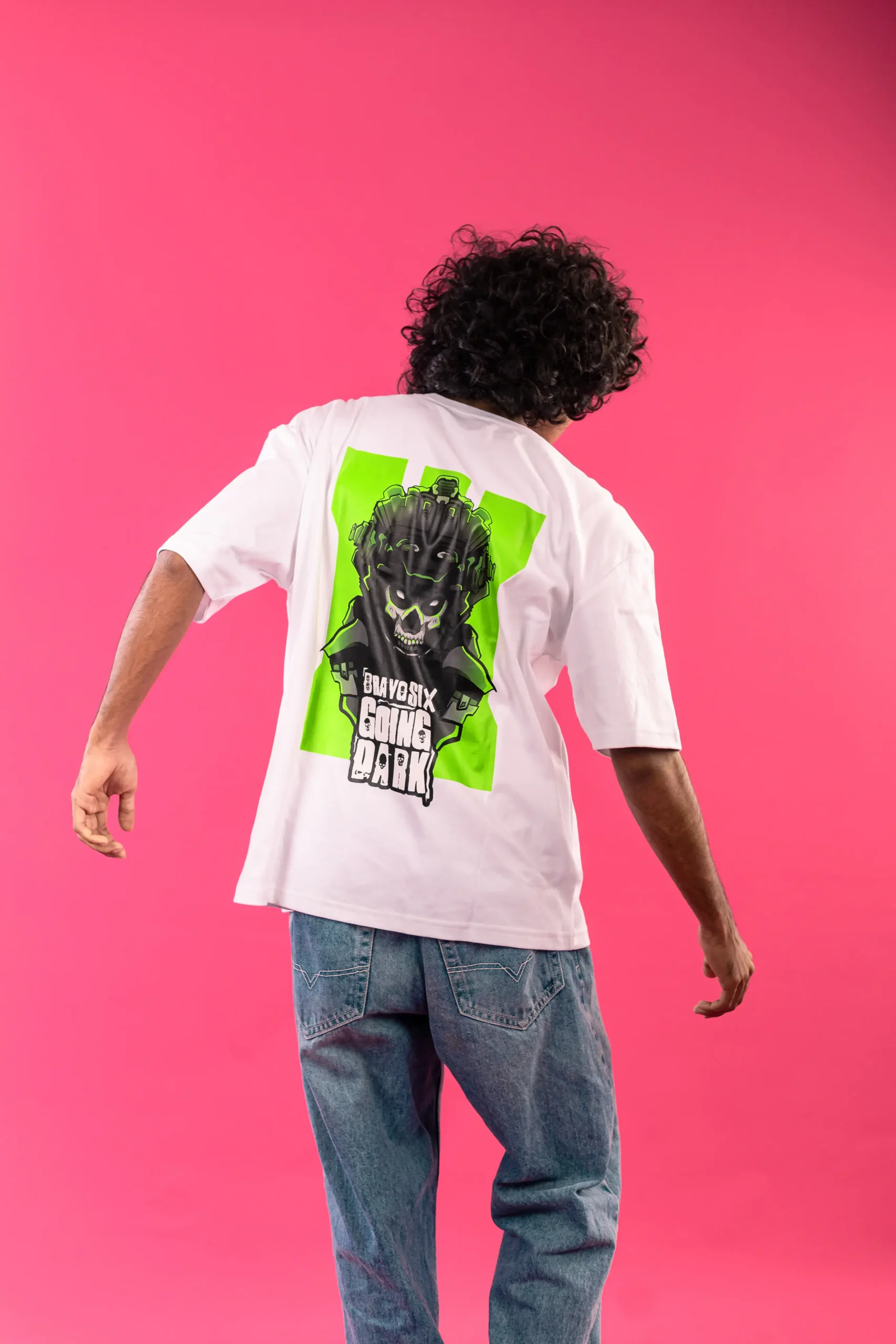 Step into the shadows with our Ghost Going Dark oversize tee, inspired by the iconic character from Call of Duty. This bold design features Ghost in his signature skull mask and night vision gear, set against a glowing neon green background.